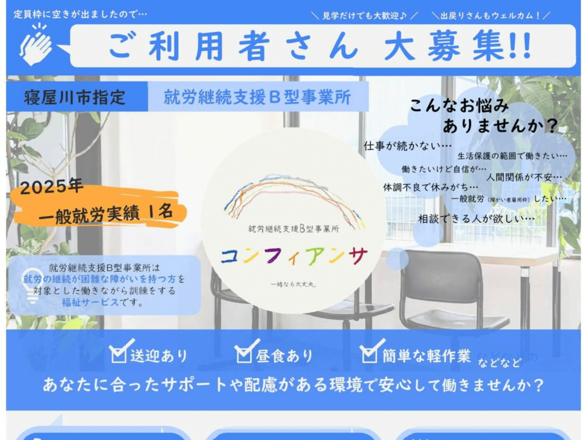 寝屋川市指定の就労継続支援B型事業所 コンフィアンサ。
